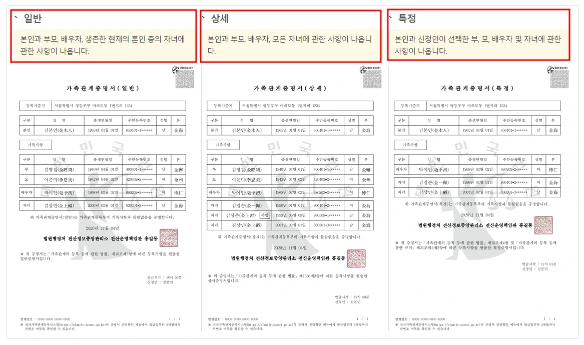 가족관계 증명서에는 여러 종류가 있으며, 주로 기본 증명서와 가족관계 증명서가 있습니다.