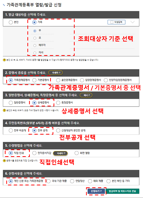 배우자, 직계존비속(부모, 자녀), 형제자매가 가족관계증명서를 대리로 발급받을 수 있습니다.
