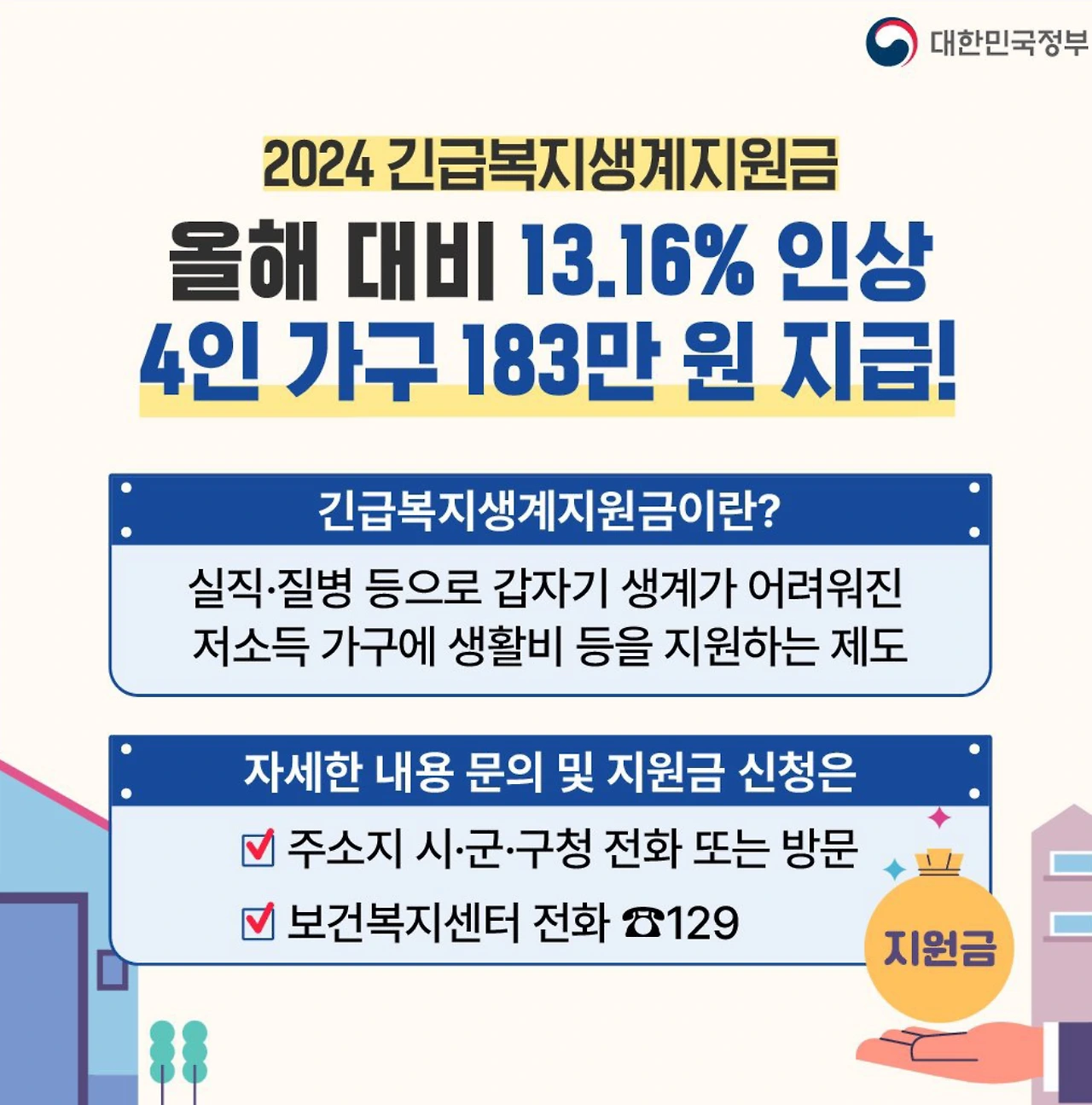 2024년 긴급복지 생계지원금은 갑작스러운 경제적 어려움을 겪는 국민들에게 긴급하게 지원되는 생계보조금입니다.
