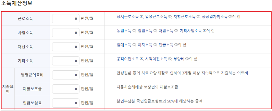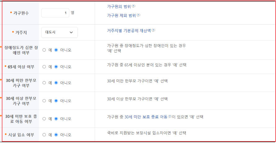 2) 가구원 수, 소득 정보, 재산 정보 등을 입력합니다.