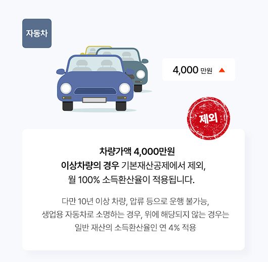 ● 자동차: 3,000cc 이상의 차량 또는 차량 가액이 4,000만 원 이상인 경우 기본 재산 공제에서 제외됩니다. 이 경우 월 소득 환산율이 100% 적용됩니다.