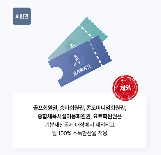 ● 회원권: 골프, 승마, 콘도미니엄, 요트 등의 회원권을 소지한 경우 기본 재산 공제 대상에서 제외되며, 이 역시 월 100% 소득환산율이 적용됩니다.