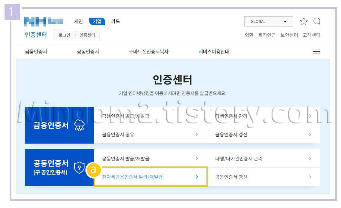 4) 사업자용 전자계산서 공인인증은 일반 개인인터넷 뱅킹 인증센터가 아닌, 기업 인터넷 뱅킹 인증센터를 통해서 발급받아야 합니다.
