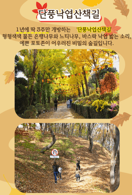 1년에 딱 3주만 개방하는 '단풍낙엽 산책길'을 걸으며 형형색색 물든 은행나무와 느티나무 등 다양한 단풍나무들이 물든 길을 산책하며 힐링을 경험할 수 있습니다.
