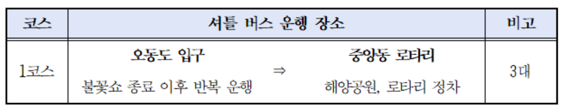 3) 셔틀버스: 오동도 및 주요 거점에서 출발하는 셔틀버스가 운영되며, 귀가 시에도 밤 11시까지 셔틀버스가 제공됩니다.