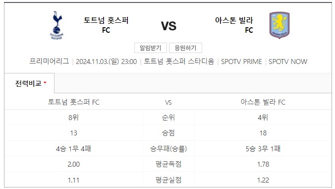 다가오는 2024 프리미어리그 10라운드에서 토트넘과 애스턴빌라가 맞붙습니다.