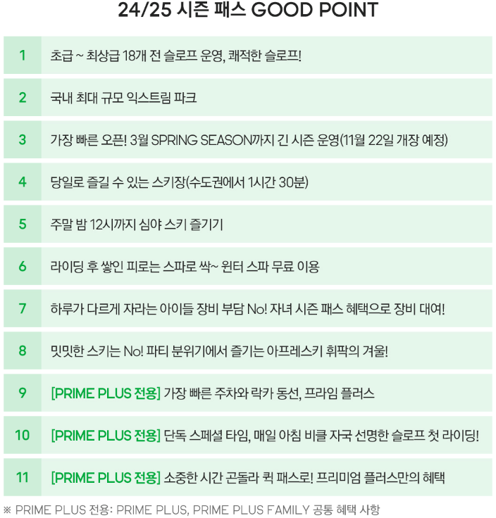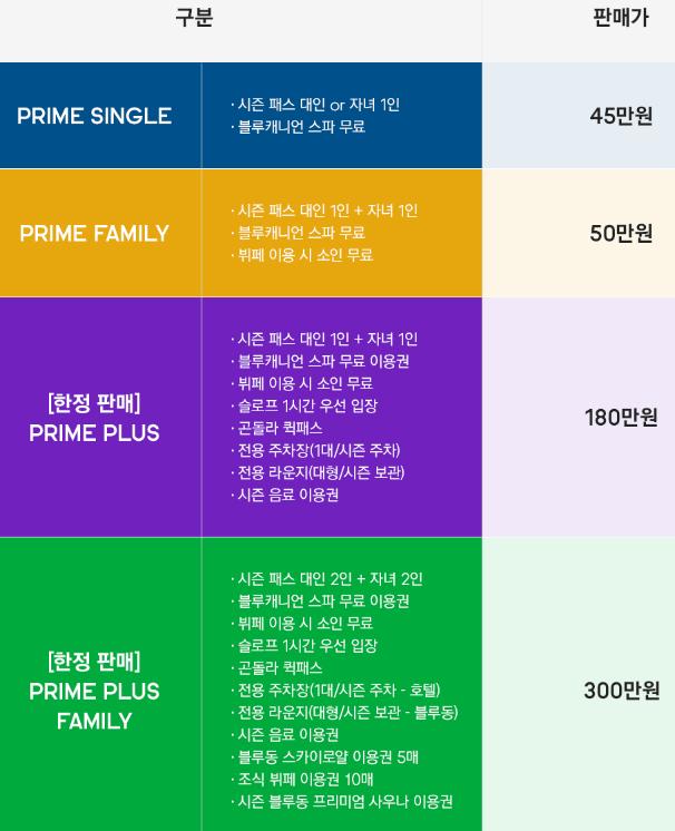또한, 프라임 패밀리 시즌권 이상 소지자에게는 19세 미만 자녀 무료 시즌 패스가 제공되며, 가족 단위 이용자들에게 더욱 풍성한 혜택을 제공합니다.